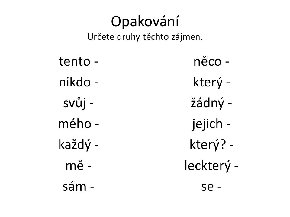 Doplňuješ správné zájmeno podle jeho druhu.